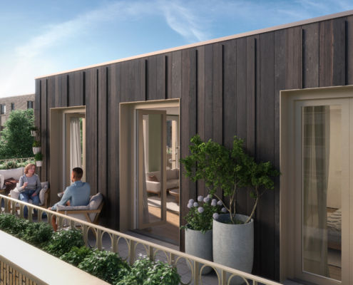 Op de tweede verdieping zijn de gevels van zowel de rijwoningen als het appartementengebouw iets naar achteren geplaatst. Dit zorgt ervoor dat de gevellijn rondom het gebouw naar binnen springt, waardoor een herkenbare uniformiteit in het plan ontstaat. Tegelijkertijd wordt de afstand tot de omliggende woningen vergroot en oogt de bouwhoogte lager dan bij een traditionele kap. Een mooi bijkomend voordeel is dat u hierdoor op de tweede verdieping de beschikking krijgt over een fijn dakterras.